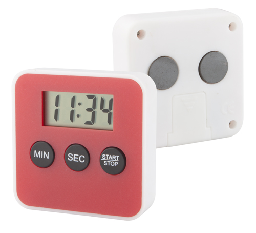 Plastová kuchyňská minutka a hodiny s digitálním displejem a magnety. Dodáváno s knoflíkovou baterií.