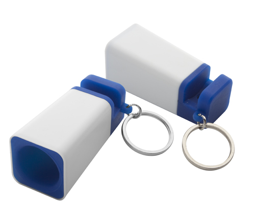 Plastová klíčenka se stojánkem na mobil s klíčenkou a čistítkem na displej.