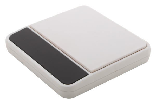 Plastový podšálek s otvírákem na láhve, s LED světlem pro osvícení laseru a knoflíkovými bateriemi..