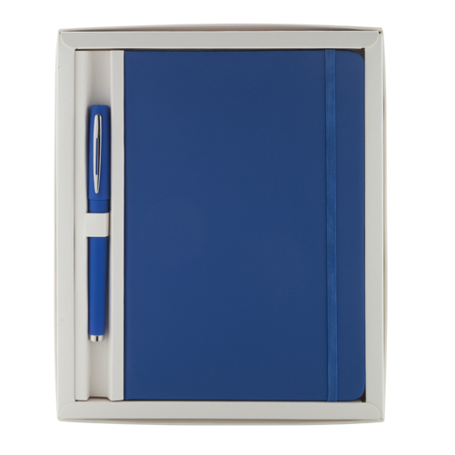 Sada s blokem s deskami z PU kůže se 100 listy a stejně barevným plastovým kuličkovým perem s modrou náplní, v bílé dárkové krabičce.