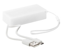 Plastová USB power banka s 4000mAh baterií. Dodáváno s poutkem a mikro USB nabíjecím kabelem.