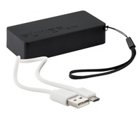 Plastová USB power banka s 2000mAh baterií. Dodáváno s mikro USB nabíjecím kabelem.